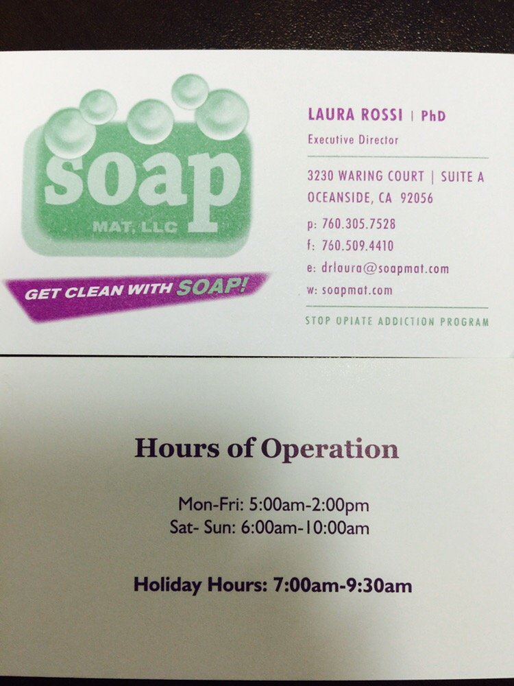 SOAP MAT is an substance abuse treatment center that provides outpatient detoxification, for men and women from 18+ years of age. As part of their special programs, SOAP MAT To help patients achieve sobriety, SOAP MAT provides intake assessments. Afterward, patients receive group counseling. during treatment. SOAP MAT is located in Oceanside, California, providing treatment for people in San Diego County, accepting cash or self-payment, sliding fee scale (fee is based on income and other factors), and medicare.
